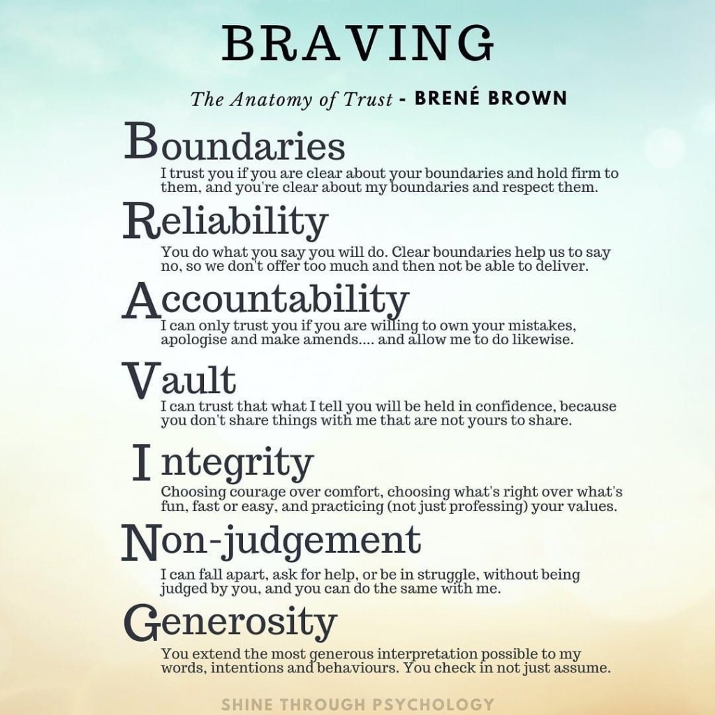 Chapter 7 of Dr. Brenè Brown’s “Braving the Wilderness” inspired me to dig deep into having a strong back while maintaining a soft front. What’s a strong back? Well, it starts with the acronym BRAVING. Dr. Brown provides this to show how true belonging begins with trust.